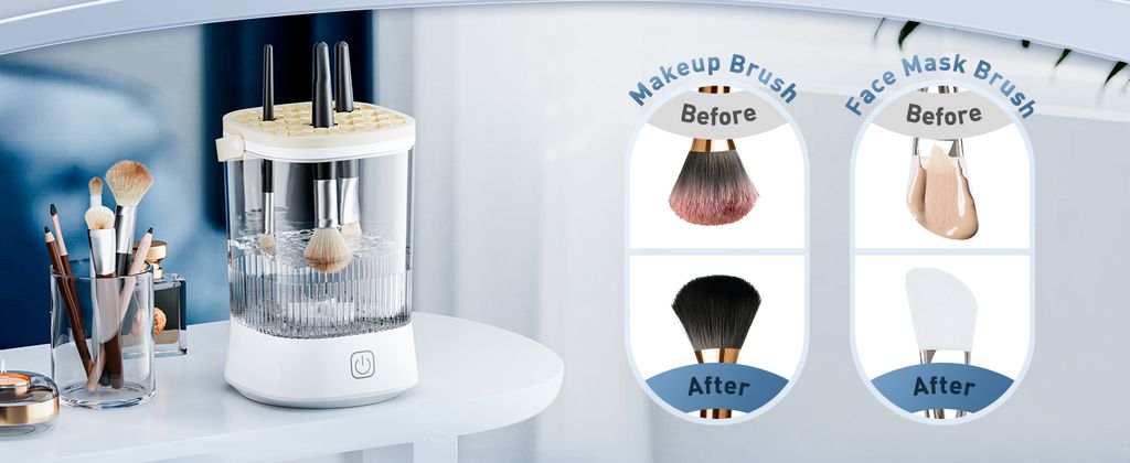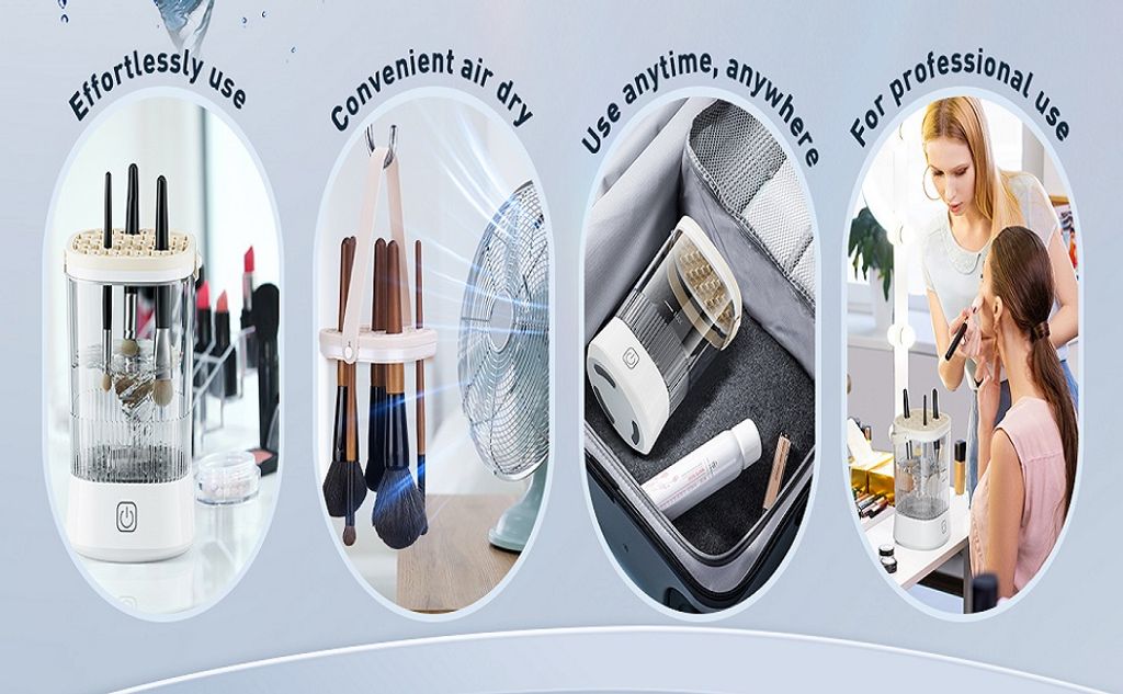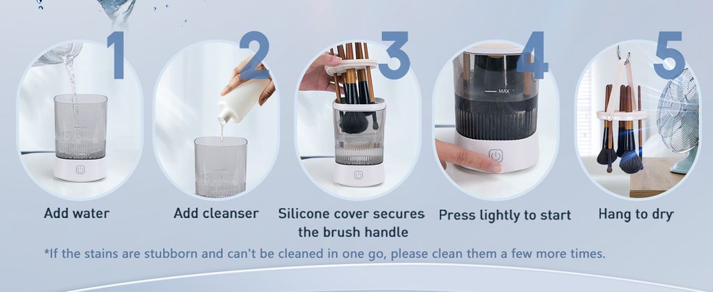 - 【Effortless 3 Step Operation】Simplify your cleaning routine with our makeup brush cleaner, which allows for simultaneous cleaning of multiple brushes. Simply follow these steps: 1. Pour water and cleaning solution into the cleaner. 2. Attach your brushes to the silicone holders. 3. Press and hold the switch for 3 seconds to initiate the cleaning cycle. 4. Utilize the hanging handle for natural air-drying. The included cleaning pad facilitates the removal of stubborn stains and doubles as a storage container for your brushes when used with the machine.