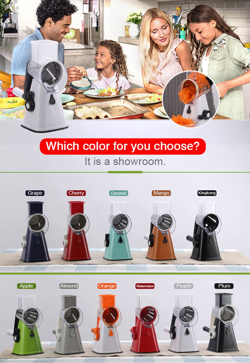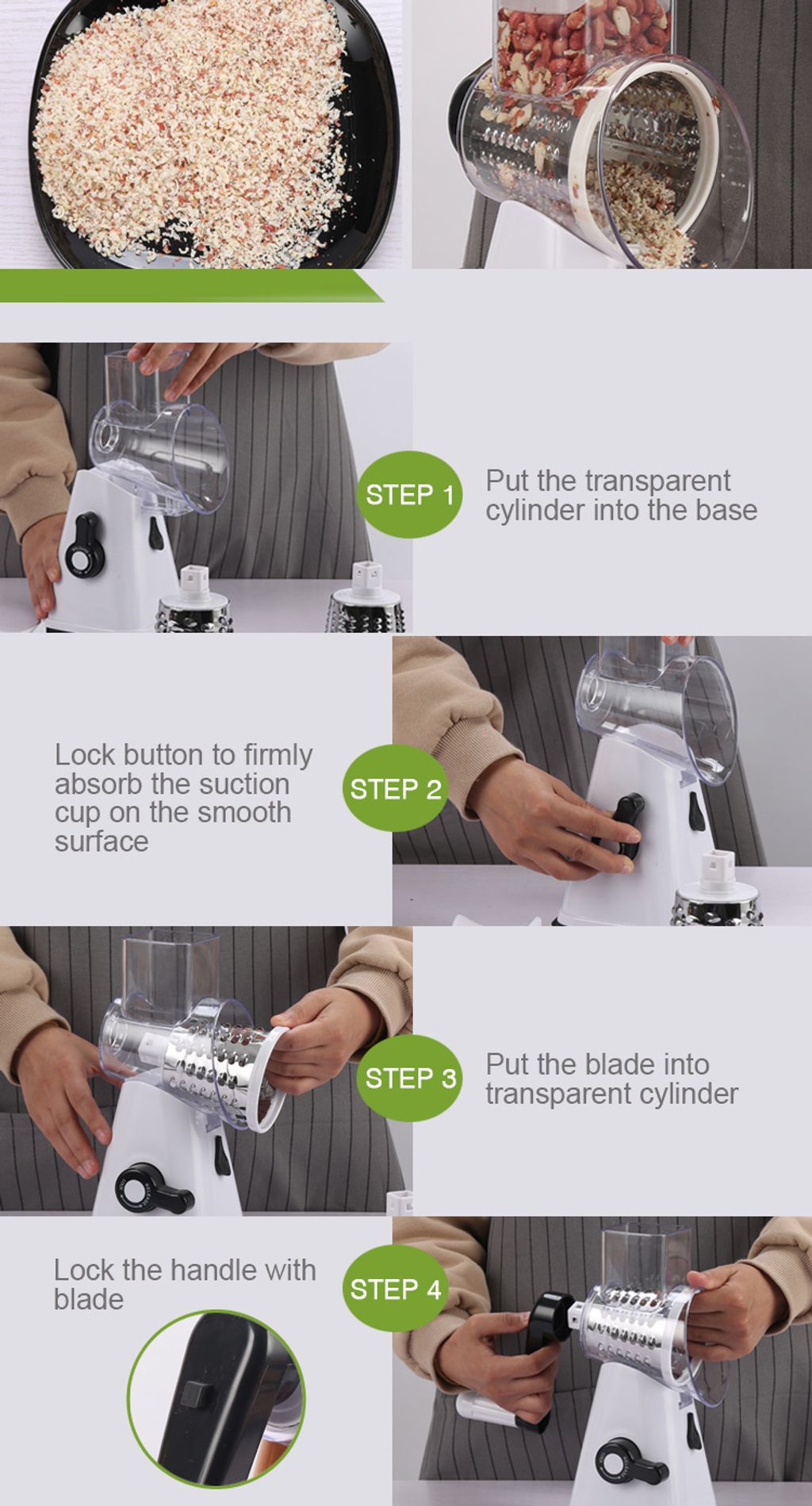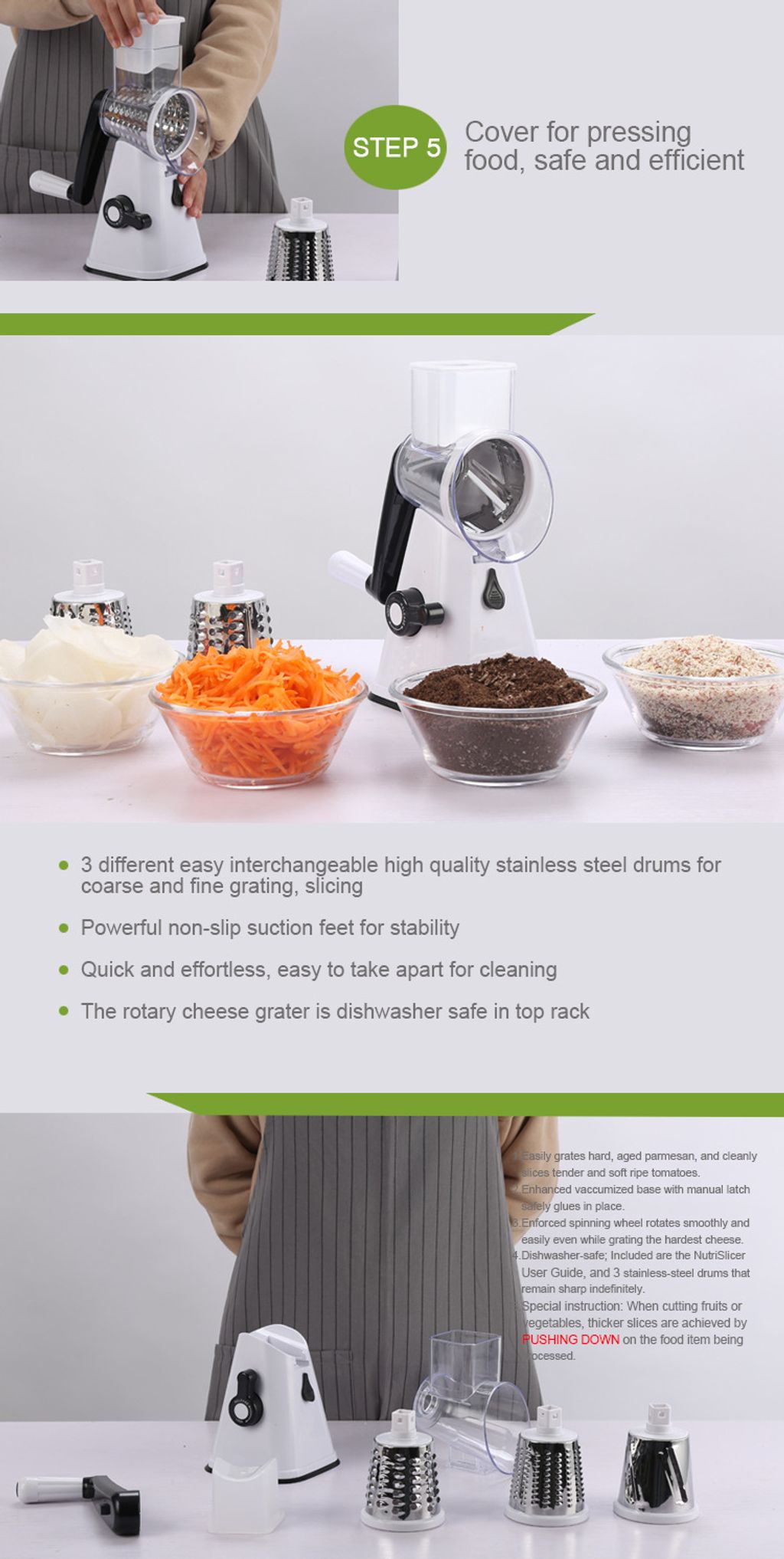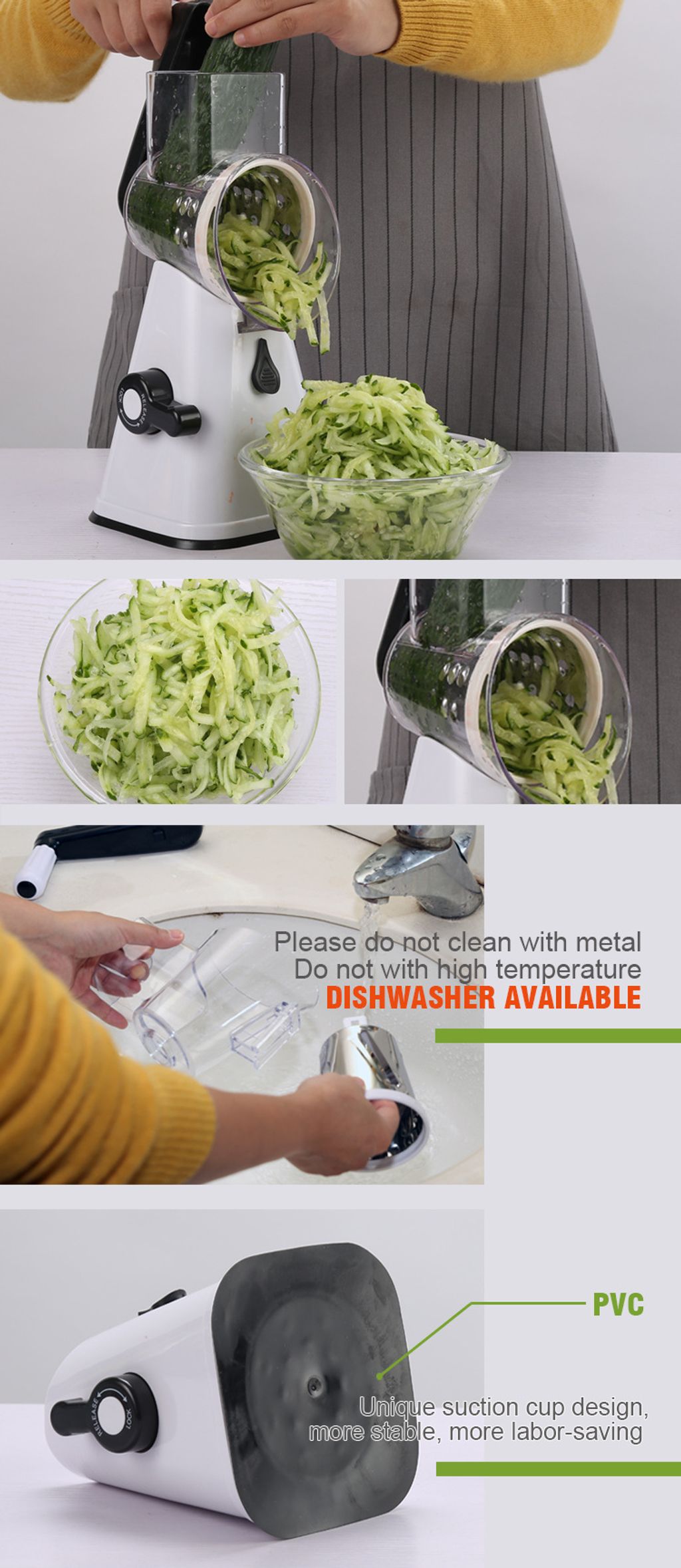 - Humanity Design & Stable Suction Cup: The humanity design of the cheese grater made customer easy to operate, and it can be firmly fixed on the smooth work table, one-button lock, prevent falling off. We provide not only good rotary cheese grater, but also good services. If you have any problem with the kitchen gadgets, just feel free to contact with us,we will solve the problem for you in time!